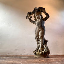 A good scale 19th century carved limestone garden statue of a putti holding a garland aloft.