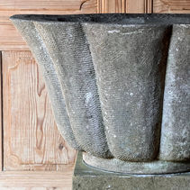 A large and handsome 19th century French carved stone oval planter raised on a later composition 2 section plinth.
