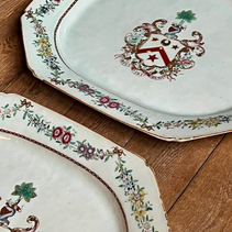 A wonderful pair of 18th century Chinese Export 'famille rose' meat plates bearing the Wilson family coat of arms above the motto 'Virtus Sibi Praemium'. England, c1760. 16.5" x 13.5", No cracks or restoration.